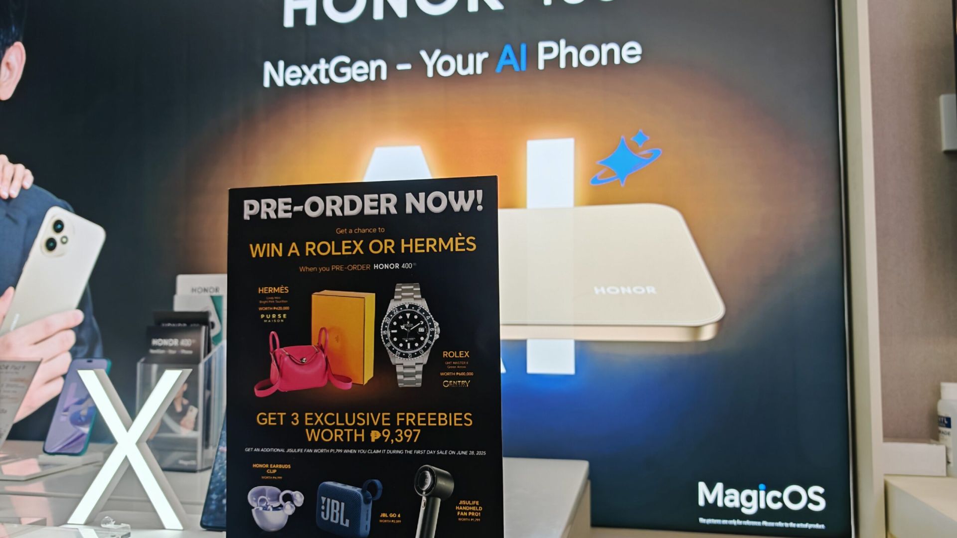 The internet is going frantic yet again as some have spotted HONOR’s whopping giveaway prizes worth Php 1 million! As seen in HONOR Experience and Partner stores, early promo leak of the upcoming HONOR 400 5G has been revealed. You can get a chance to win a Rolex GMT Master II Green Arrow worth Php 600,000.00 and an Hermés Lindy Mini worth Php 420,000.00!