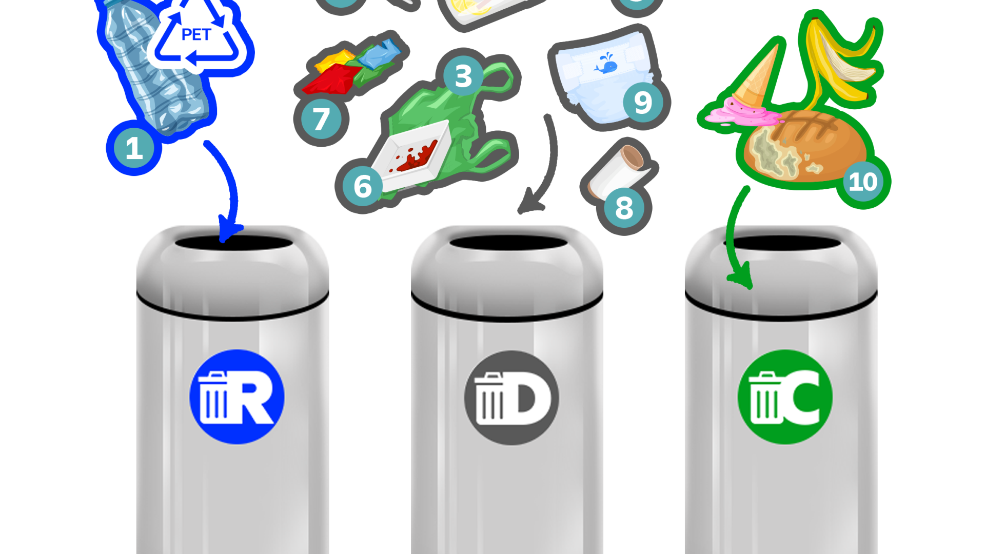 Disposable items and containers such as plastic cutlery, single-use plastic, plastic cups from coffee or milk tea, soiled coffee paper cups and food containers, food packaging and sachets, and soiled tissue or napkins, diapers, and sanitary products are for tossing into the gray “Disposable” Bins.